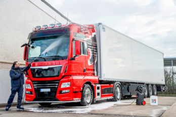 - Kraftvoller Schaumreiniger zur Reinigung von Planen, Aufbauten und Chassis an LKW, Bussen und Baumaschinen